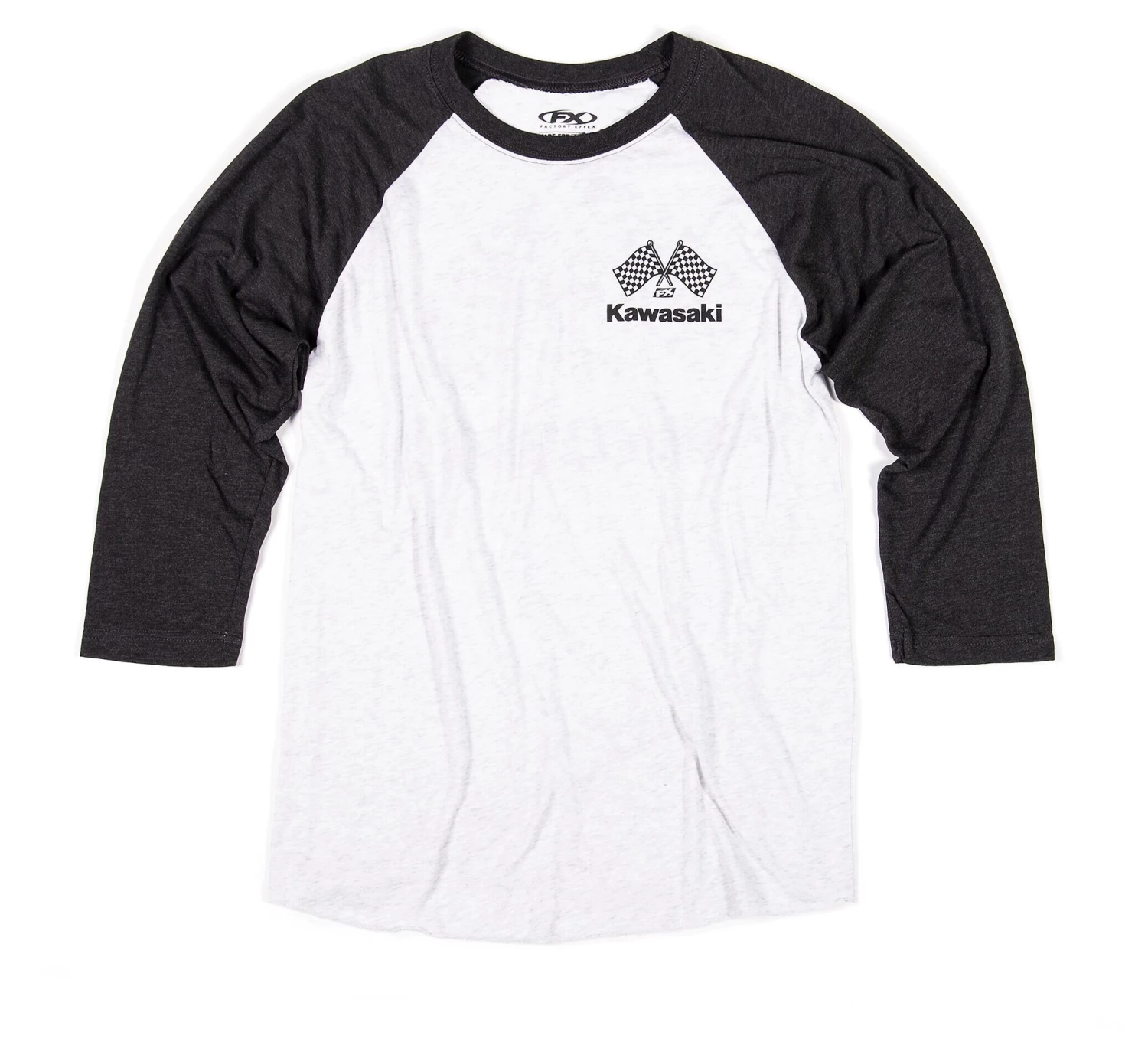 Officially licensed Kawasaki 3/4 raglan sleeve baseball shirt. Contrasting ribbed collar and sleeves. Double-needle stitched sleeves and bottom hem.